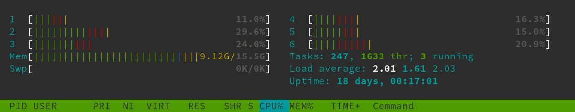 I was very impressed with the difference that this made. The CPU load reached a maximum of 25% while transcoding the same 1080p file which would have previously gone over 100% usage with CPU transcoding. I was also able to get five transcoded streams working simultaneously without issues which would of been impossible with my previous setup - probably could of tried getting more but for my usage I was happy enough with five. Below you can see a htop screenshot while transcoding the same 1080p file from above. The CPU load is much more comfortable thanks to the hardware acceleration.