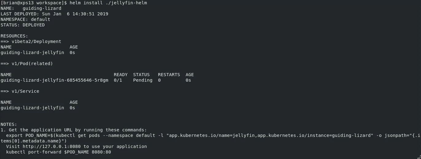 This will give you the very basic Jellyfin server which does not include persistent storage. Persistence is disabled by default. In order to enable persistence you have to update jellyfin-helm/values.yaml. If you want to point the Jellyfin instance to your existing media library, I would recommend creating a persistent volume (PV) and a persistent volume claim (PVC) which point to your media. You can then update the "existingClaim" value in the values.yaml with the name of PVC that you just created. A persistent volume is also required for the jellyfin configuration in order to ensure that the config is not lost when the pod is deleted.