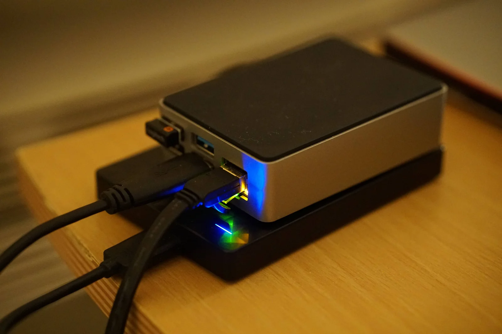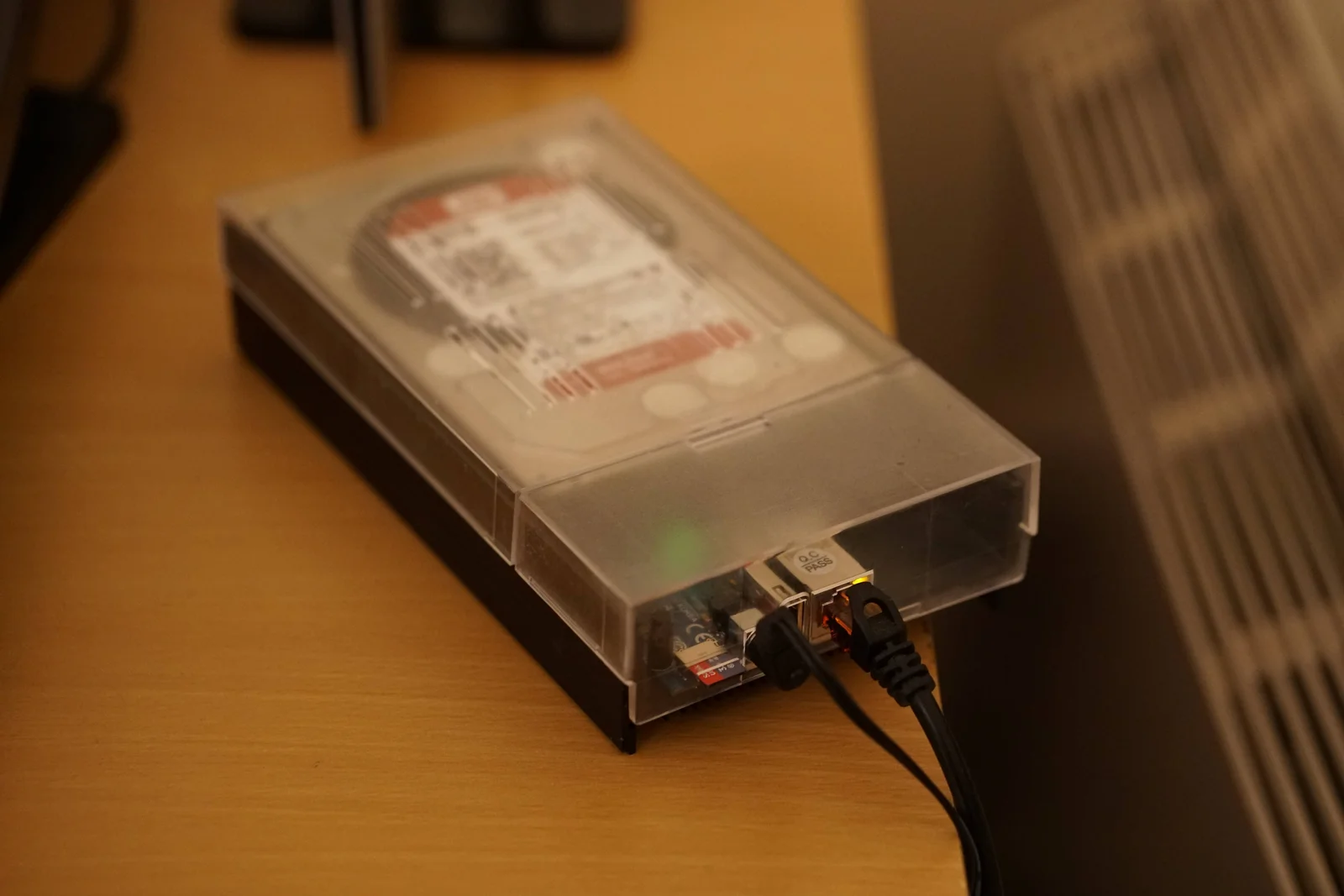 So as you have probably guessed this is my second attempt at an offsite backup solution. Version 1.0 was covered by a previous blog post but I can't really recommend going that route anymore - the performance was pretty terrible. Transfer speeds were in the Kb/s range rather than Mb/s range. This meant that if I added a few hundred photos to my local NAS it could take the best part of a week for the backup server to catch up which wasn't really ideal. The previous solution consisted of a Raspberry Pi 3b+ and an old 2TB external USB HDD as you can see below. The old post is available here but again I don't really recommend trying it out as the performance was so bad.