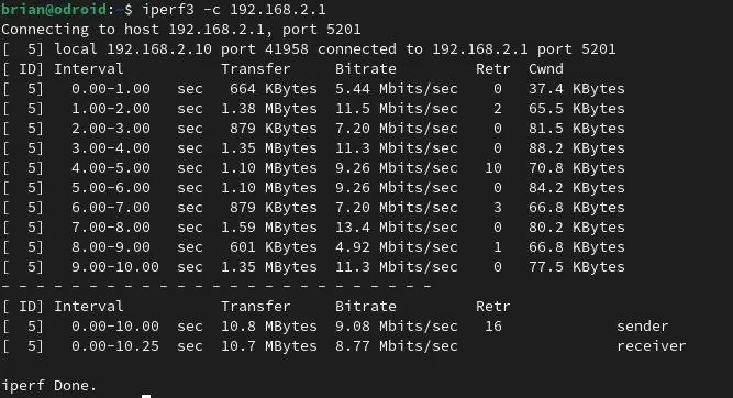 The Wireguard tunnel has been solid since this configuration update and the performance has been pretty impressive. Here you can see an iperf test between the onsite peer and offsite peer to give you an idea of the kind of network performance that I am getting over the Wireguard tunnel.