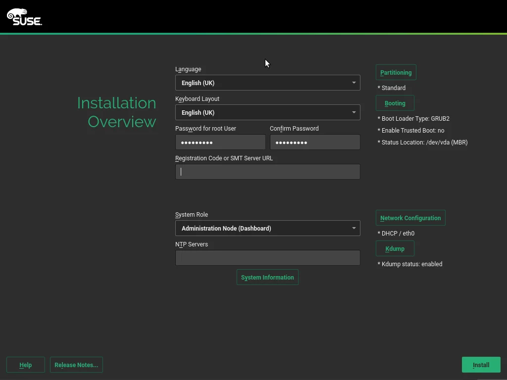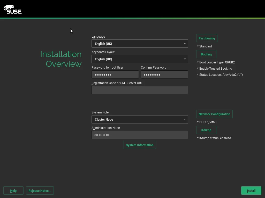 The install procedure is pretty much a trimmed down version of a standard SLES server install. Enter your language/keyboard preferences, root password and your registration code. Once the details have been added click install.