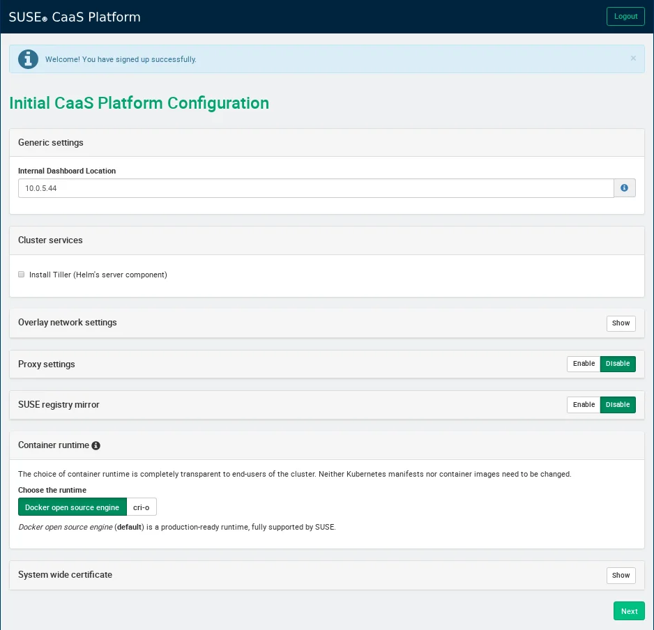 You will see the available options for configuring your SUSE CaaS cluster once you have a user created in Velum. Most of the default values should be good to get you up and running. Enter the IP address of your admin server that is reachable by the rest of your cluster as the Internal Dashboard Location. For this deployment I went with Docker as the container runtime - I am going to try out cri-o next time as I haven't had a chance to play with that yet.