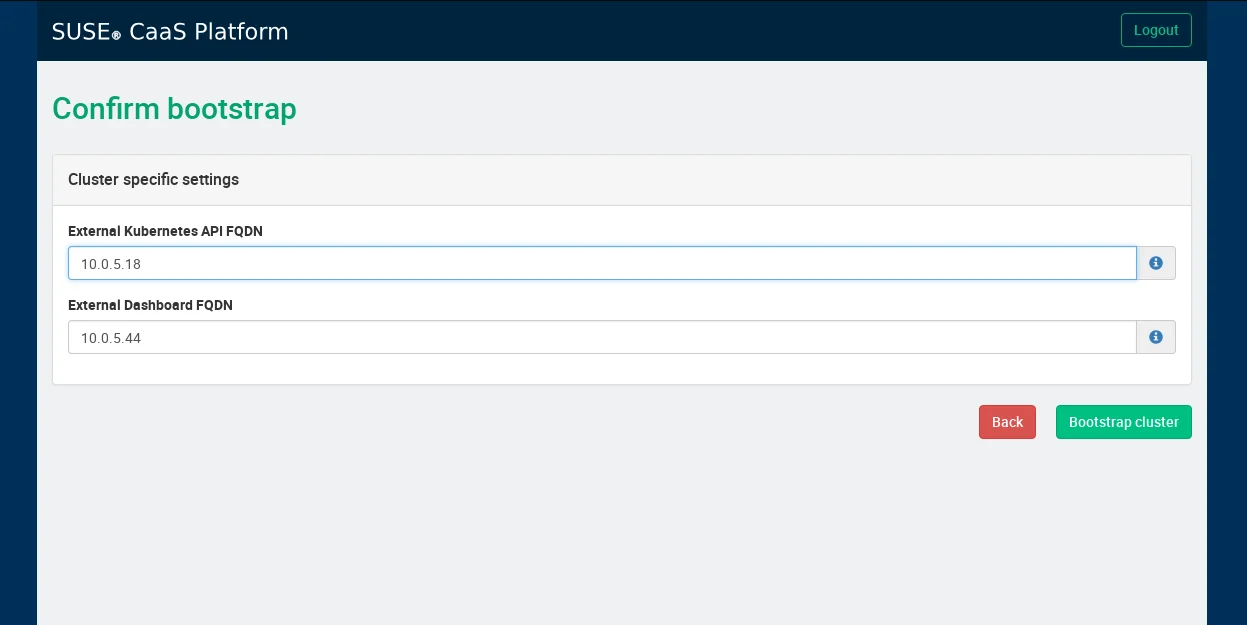 Enter the IP addresses used to access both the Kubernetes Dashboard and Velum from outside of the cluster - these really should be FQDNs but you can get away with IP addresses for test environments
