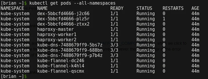 The default set of pods deployed can be seen by running 'kubectl get pods --all-namespaces'. Here we can see that they went with flannel for the CNI (Container Network Interface). Authentication within the cluster is handled by the dex pods.