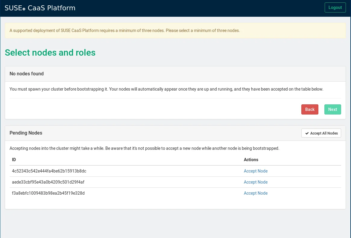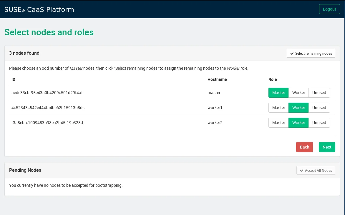 After you have all your cluster nodes installed, you should see them appearing in Velum as pending nodes. Accept the pending nodes and assign the relevant roles to the cluster nodes - this is where I find it handy to have meaningful hostnames for the nodes