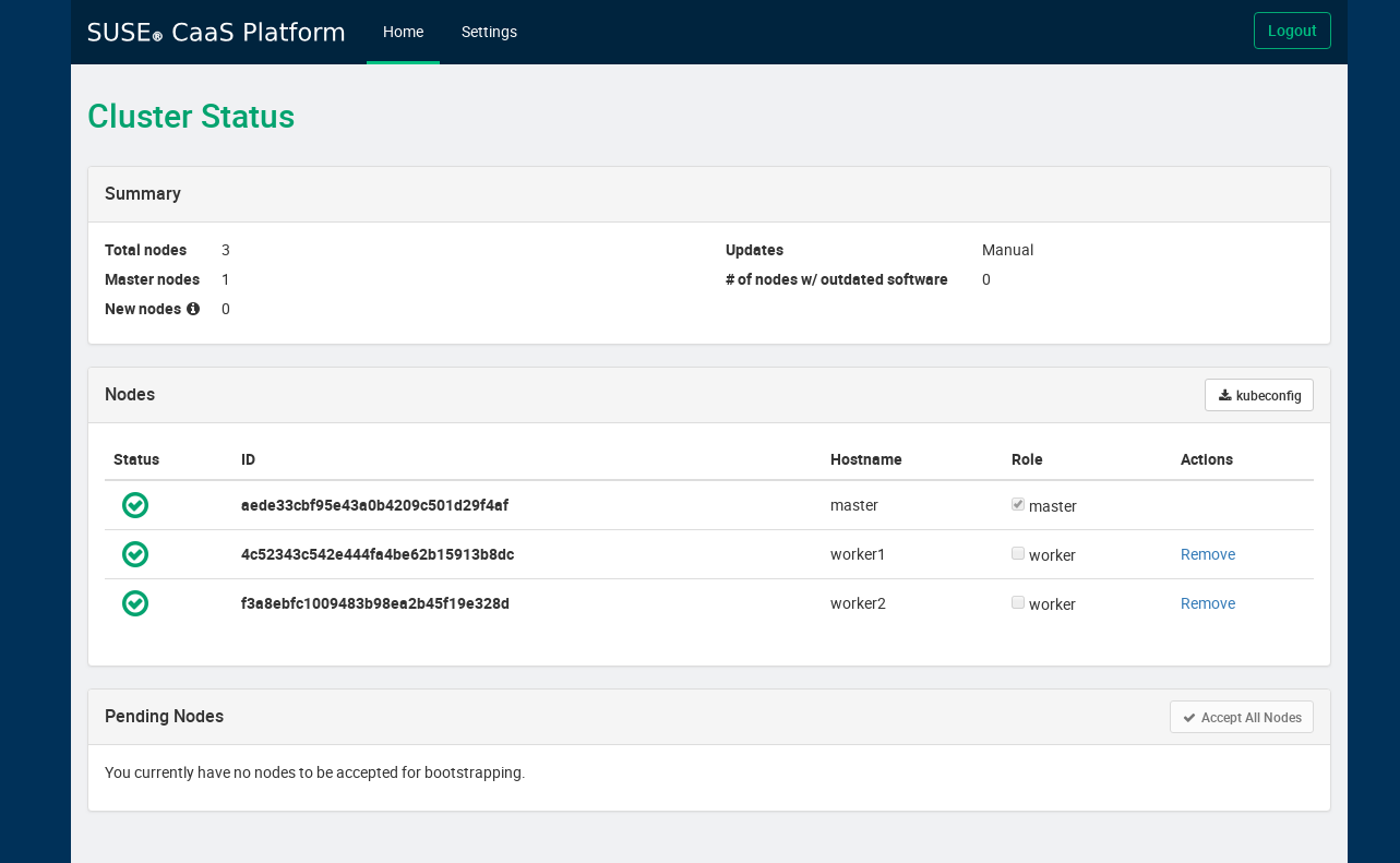 After you have all your cluster nodes installed, you should see them appearing in Velum as pending nodes. Accept the pending nodes and assign the relevant roles to the cluster nodes - this is where I find it handy to have meaningful hostnames for the nodes